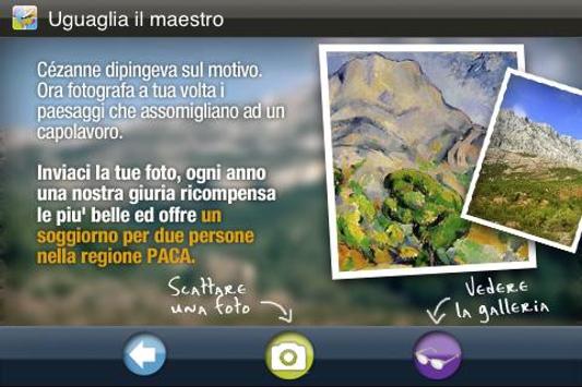 Vera accompagnatrice del tuo soggiorno in Provenza Alpi Costa Azzurra, l'applicazione Gallery PACA ti avvertirà ogni volta che starai nei pressi di un paesaggio che ha ispirato i più grandi artisti. Potrai ascoltare la storia del quadro zoomando nelle riproduzioni, troverai inoltre aneddoti sui pittori e la regione...