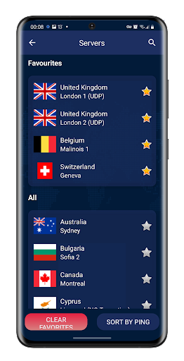 - Server sort is default by country and button option to sort by ping