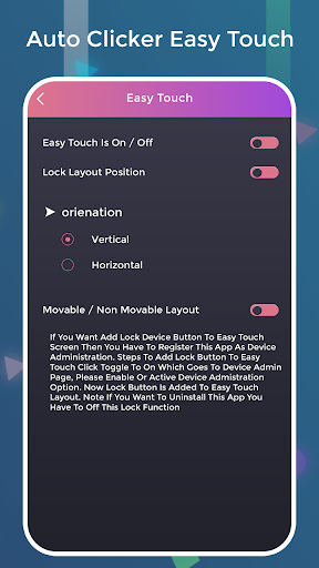 Now no need to stop or pause the game while an important notification is coming, just use our easy touch option and handle both of options. easy touch option allows users to fast reach on your home screen, recent app, notifications or also allow to lock your mobile screen with your choice.app also provide users to use auto clicks to make more easy your touch. it has an option to set your clicks with perfect time duration with repeat clicks with a specific time interval.