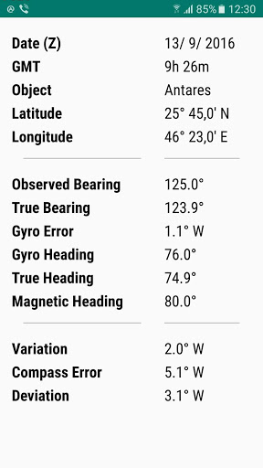 Once the azimuth is calculated, entering gyro bearing, heading, magnetic heading, variation will