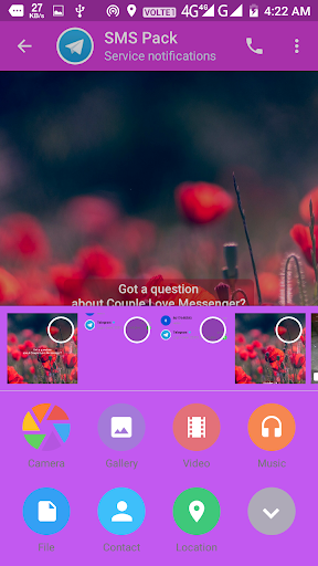 For those interested in maximum privacy, Couple Love Messenger offers Secret Chats. Secret Chat messages can be programmed to self-destruct automatically from both participating devices. This way you can send all types of disappearing content — messages, photos, videos, and even files. Secret Chats use end-to-end encryption to ensure that a message can only be read by its intended recipient.