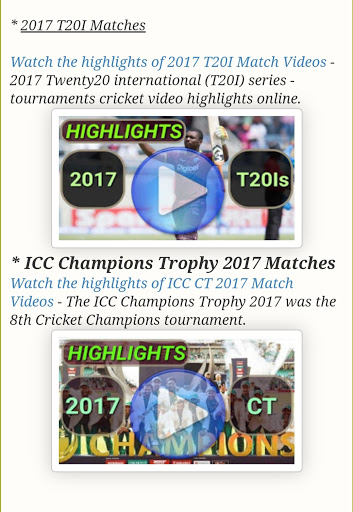 This app gives you latest cricket match highlights, popular videos, classic videos, batsman special videos, bowlers special videos, thrilling match videos and more.