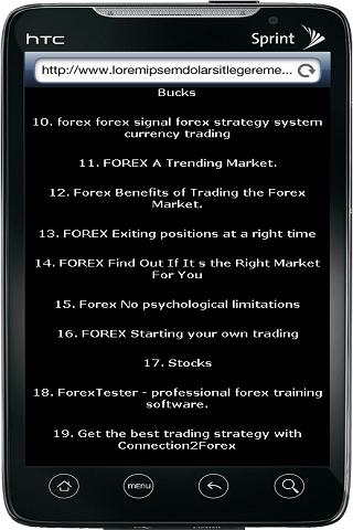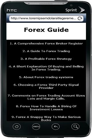 This Forex guide contents Following Topics:A Comprehensive Forex Broker RegisterA Guide To Forex TradingA Profitable Forex StrategyA Short Explanation Of BuyingandSellingIn Forex Trading.About Forex trading systemsChoosing a Forex Third Party Signal ProviderComments on Forex Trading Account SizesLots and Margin Calls.ForexHow To Handle A String Of InvestmentLossesForexA Snappy Way To Make SeriousBucksforexforex signalforex strategy systemcurrency tradingFOREXA Trending Market.Forex Benefits of Trading the Forex Market.FOREX Exiting positions at a right timeFOREX find Out If It s the Right Market For You Forex No psychological limitationsFOREX Starting your own tradingStocksForexTester - professional forex training software Get the best trading strategy with Connection2ForexGetting Started in the FOREXForeign ExchangeMarketGetting Started With FOREX Trading
