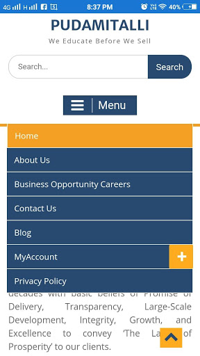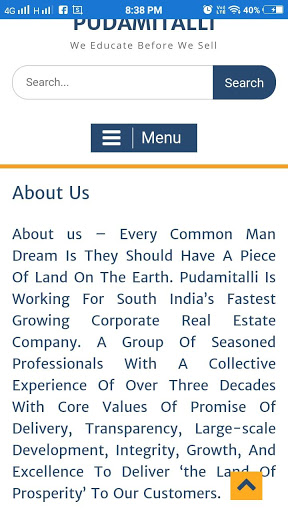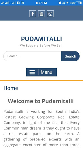 The Purpose of Pudamitalli application is to educate the people before selling our products, so that the people can choose right product according to their need and requirements and also pudamitalli will guide them where you need to invest your hard earned money on land. we are working as corporate real estate company to make our services more transparency to our customers.