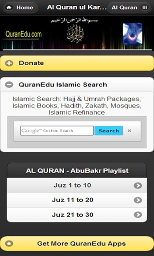 Find More Apps from QuranEdu -> search for QuranEdu Apps in Google Play Market.Complete Quran Juz' ( 1 - 30 ) Shaikh Abu Bakr Ash-Shatiri- FreePlease help QuranEdu to develop more Apps by purchasing the Donate Version of Al-Quran by Shaikh Abu Bakr Ash ShatiriAll of your Donation will be used to improve http://www.QuranEdu.com QuranEdu - Broadcasting On-Demand TV Android.What are the requirements to run QuranEdu Apps?To run QuranEdu Apps, your Android OS version must be 2.2 or higher, and you must have a good Internet connection enabled. I start an App but I don´t see anything. Why?If your App doesn´t run or is running incorrectly, there are several possible reasons:1.) Your Android OS version is lower than 2.22.) You mush have Java enabled on your device from browser Settings. 3.) You haven´t established an Internet connection via Wi-Fi or mobile network (4G - Recommended due to video stream).Visit: http://www.QuranEdu.com (Become a Member Today!)QuranEdu - Islamic social network Muslim Ummah Community Site.DISCLAIMER: The content provided in this app is hosted by YouTube and is available in public domain. QuranEdu App is just an organised way to browse and view these YouTube Videos.App requires 3G/4G/WiFi connection to Watch Movies. (Recommended WiFi or 4G for HD broadcast of Videos - QuranEdu App player will decide upon you internet speed)IMPORTANT: Note - 3G/4G data plan tariff is required as the video content is streamed from YouTube.