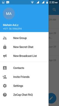 For those interested in maximum privacy, ZeCap Messenger offers Secret Chats. Secret Chat messages can be programmed to self-destruct automatically from both participating devices. This way you can send all types of disappearing content — messages, photos, videos and even files. Secret Chats use end-to-end encryption to ensure that a message can only be read by its intended recipient.