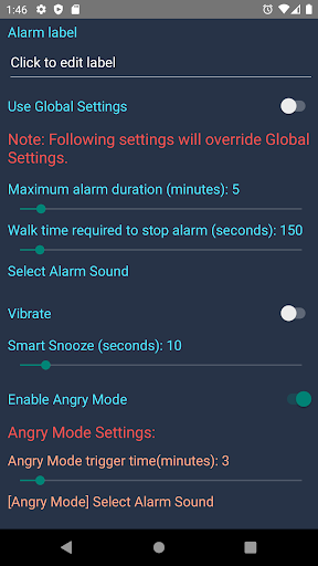 - Angry Mode. If enabled, Angry Mode will be triggered if your alarm has been ringing for some time (Angry Mode trigger time). On entering angry alarm mode, the alarm clock will switch to secondary settings(Angry Mode settings) and change the alarm Ringtone, Smart Snooze duration and Sensitivity accordingly.
