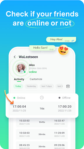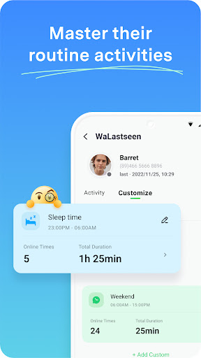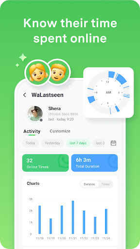 WaLastseen is a very powerful yet simple lastseen Messaging (Whats)App tracker, and you will find it easier than ever to know the activity on Chat (Whats)App, Chat (Whats) App Business, and other apps. With Chat (Whats) App tracker-WaLastseen, you can easily analyze in depth the usage and daily patterns of the one you track and know their lastseen status even they hide their status in Chat (Whats) App. 🤩