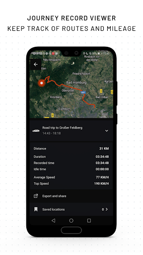 • GPS journey recorder lets you keep track of travel time, mileage, routes and performance.