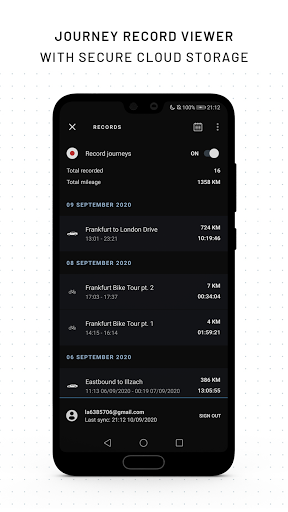 • Journey history viewer with odometer and detailed statistics on your recorded journeys.