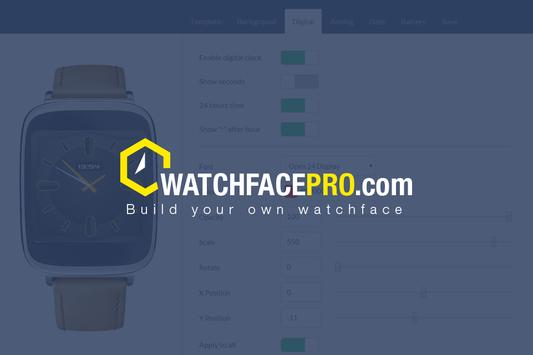 WatchfacePRO is a place to build custom watchface for Android Wear devices like Moto 360, LG G Watch, LG G Watch R, ASUS ZenWatch, Sony SmartWatch, Samsung Gear and others.