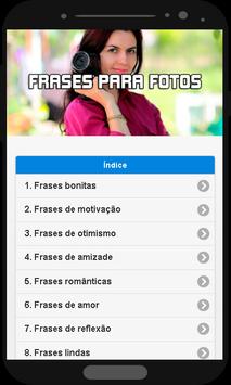 O aplicativo Frases Para Fotos foi criado para usuários que buscam frases bonitas para postar com as fotos. Deixe suas fotos mais interessantes com belas mensagens. Os programadores fizeram um bom trabalho, pois o software funciona em 99% dos aparelhos móveis, facilitando o acesso da comunidade. Usufrua, gratuitamente, desse conteúdo que é atualizado periodicamente. Além disso, o app divide os assuntos em capítulos de forma clara e organizada. Baixe e instale agora mesmo e não fique de fora. Aprenda tudo sobre Frases Para Fotos.