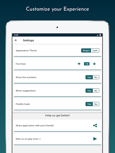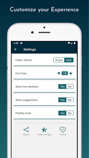 We know you will be using our app for long time duration with daylight and as well with nightlight, hence for your convenience we have introduced two themes: Dark (Suitable when using app with little to no sunlight) and Bright (Suitable when using app with excess sunlight). Our editor is also capable of highlight syntax on both themes. Users can easily change themes by going to settings screen. Moreover, if the users want to change the default font-size then they can easily scale the font up or down by their preference from the settings screen as well. The minimum font scale is 14 and maximum is 22. Users can also configure the settings if they want to prettify the code on save and want to see suggestions while typing.