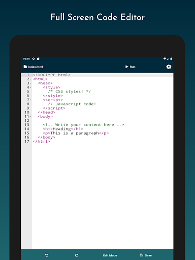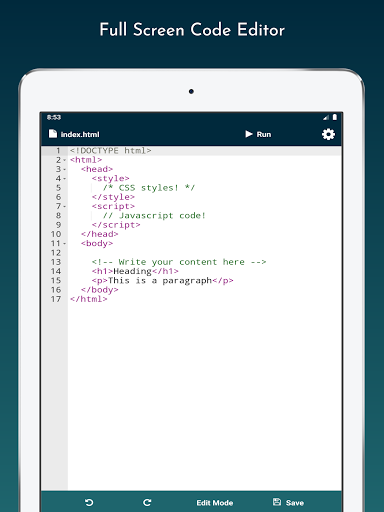 For better editing experience you will get full screen editor to edit and preview your code. With the full screen mode, you can easily scroll-up, scroll-down or jump to your desired section. The full screen editor will give you the same feel as you get in laptop or personal computer. If you are tired looking at the code with same white color effect (which makes it harder to understand the code) then do not worry, we have syntax highlighting done for you. With different color schemes for different type of keyword and functions. You can easily get the high-level idea of the opening and closing tags with the help of syntax highlighting. In addition to syntax highlighting we also have the code indentation applied for better visuals.