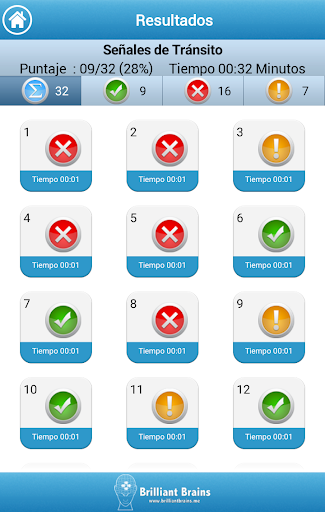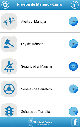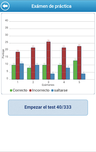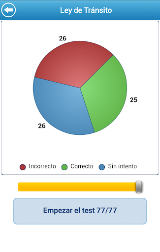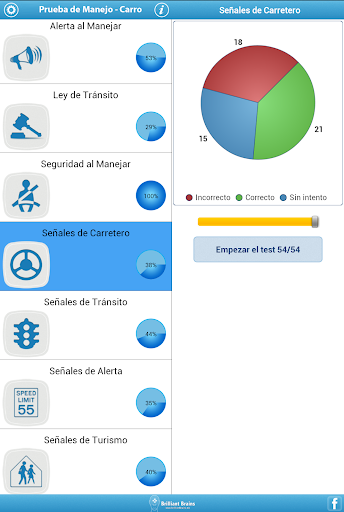 La Aplicación mantiene registrado tu avance desde el momento que empezó el test. Con un atractivo diseño, puedes revisar la información en forma de pastel y conocer tus fortalezas y debilidades en todo momento.