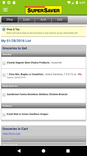• Tap the list as you shop, and the item moves to “groceries in cart” at bottom of screen