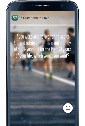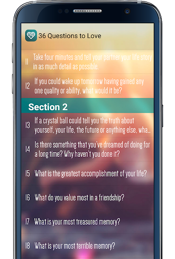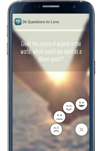 Fall in love. This simple test of 36 questions with sociological basis, aims to create a temporary connection between people who are not too familiar. The two people to open gradually in sentiemientos and his way of seeing life. The questions focused on trivial begin to cycle more intimate affairs issues. Use this application at your own risk!