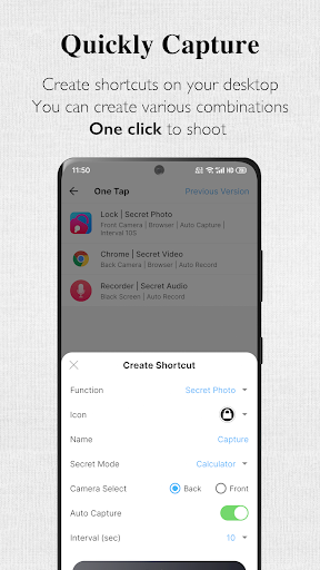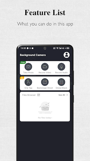 Background Camera is high quality backstage shoot app that allows you to take photo and record video without the preview. Whether you're playing games, watching live, listening to music, chatting, or using other apps. You can take high-quality photos, videos and audios at any time.