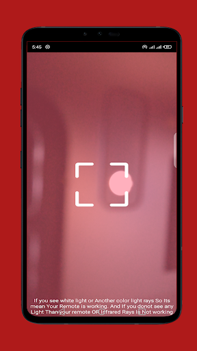 Turn on the Remote Tester app After open of the IR Remote Tester app for android. Point the end of the remote control with the Infrared transmitter Press & hold one of the Button on the remote to Test. If the remote controls is sending a signal of IR Infrared ray, you should see a Light or white light in the of view finder cell phone or mobile screen when you press button on the Car Remote and light remote Mp3 remote Ac Remote laser remote Infrared Remote IR Remote App for Android. our app detected infrared camera which is emitted by tv remotes infra camera and other remotes our Remote testers and IR Remote Controllers feature shows you white bright light which is not visible with naked eye our special IR Infrared camera detection filter. which easily Detects Infrared rays e.g infrared remote rays also Infrared camera and Infrared lights which is not visible by naked eye.