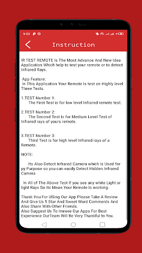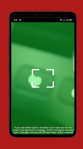Depending on whether the transmitter is visible or not follow the instructions IR Remote Tester and Infrared Scanner detect Infrared Rays. If the light of the remote control emitter is not visible when any button is pressed, there is a possibility the batteries are Damage. Switch to new batteries and check works or not the transmitter lights up. This IR Remote Tester can also enable you to detect Infrared IR spy cameras. Like remotes many spy Hidden camera devices also have infrared feature in them so our app can detect hidden cam. If the transmitter is visible than its mean its passing Infrared rays The remote control is normal. Just open Remote Tester and see through our filter. when you face the remote towards phone camera you will see a light. This light means your remote is working.