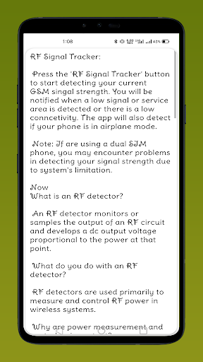 RF Signal Detector and RF Wifi Signal Tracker are used for detecting Radio Frequency Signal and View Sim card information View Network information. The advantage of this app is you can then map, record, analyze, and share that data in a meaningful way. RF detector is used View LTE and GSM signal strength and View more details of signal.