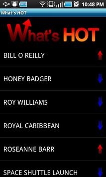 The What's HOT Widget is a simple app that helps keep you up to date on the latest trending topics. When you add this widget to your home screen you will see the top four Google search terms along with arrows that show if the topic is gaining or losing popularity. You can also select the MORE option to see the full list of the most popular Google search terms. Selecting a topic will send you to the Google News search results for that term so you can quickly find out why that topic is interesting.