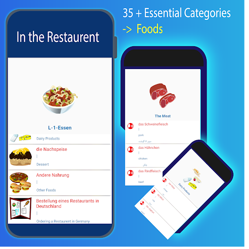 To speak and to learn German, this learning german language app will facilitate your in daily life routines whether you are driving, traveling, playing, eating, buying fruits and vegetables, visiting family, getting information, attending school, meeting people, doing job, celebrating parties and birthdays, telling about time, seasons, days, months, years, date of birth, this urdu german app will save your time everywhere.