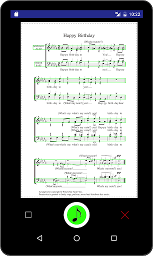 (What's My Note? DOES NOT play scores from start to finish, does not play more than one voice at a time, does not interpret rhythms, does not recognize or play piano or instrumental parts. Hand-written manuscripts and most forms of popular music probably won't work)