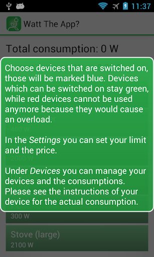 By selecting the devices that are switched on, you will immediatly get informed about which devices you still can use without having to fear a blackout caused by overload!