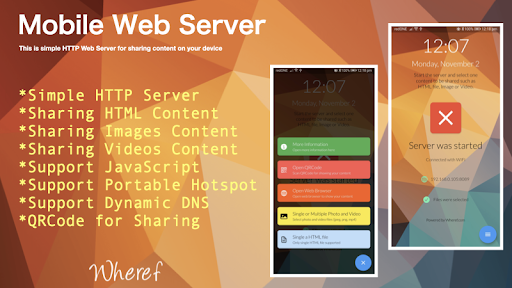 Mobile Web Server is a lightweight and fast Web Server especially designed for android mobile devices. It can be used to host websites and to serve files over HTTP. A HTML file MUST be selected as the startup page by browsing the device directory. Once the Mobile Web Server is started, a web page should be able to open according to the WIFI IP address. The Port is fixed as 8089. Thus, the URL should be in this format “http://[wifi-ip-address]:8089”. To make Mobile Web Server as a public server, a dynamic DNS server should be subscribed from Internet in order to get a valid public domain name.