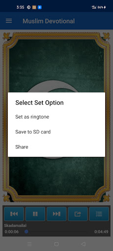 Muslim devotional tamil songs with play, pause, next, previous, select song features.