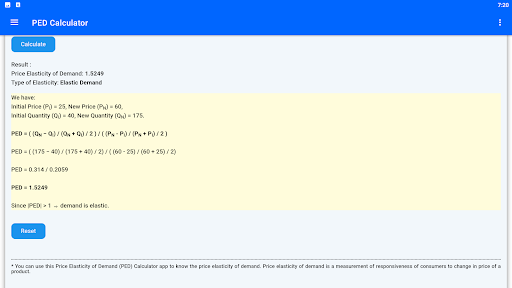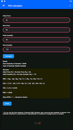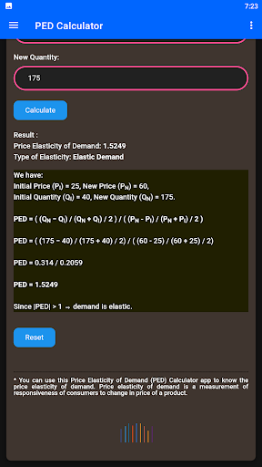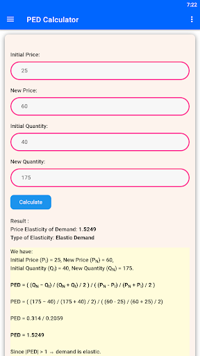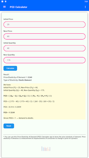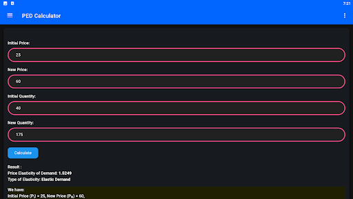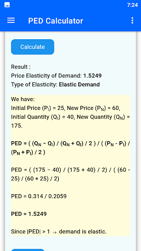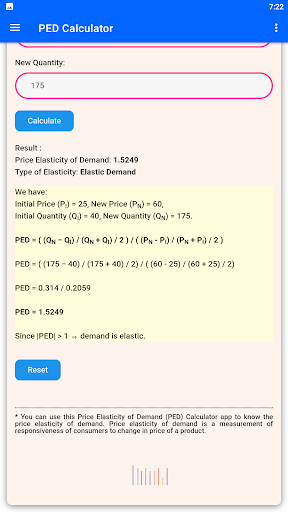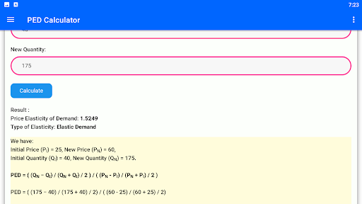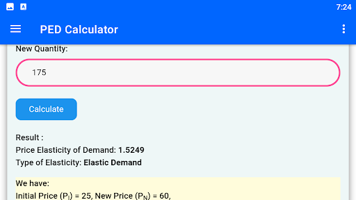 You can use this Price Elasticity of Demand (PED) Calculator app to know the price elasticity of demand. Price elasticity of demand is a measurement of responsiveness of consumers to change in price of a product.