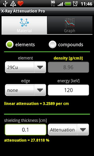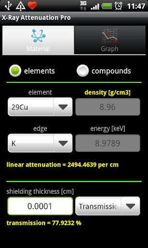 It can be used to display characteristic information of elements and compounds (x-ray edges, density, linear mass attenuation graph for a mono-energetic narrow x-ray beam) and to calculate the transmission and attenuation through a layer of a given thickness of any material in the database.