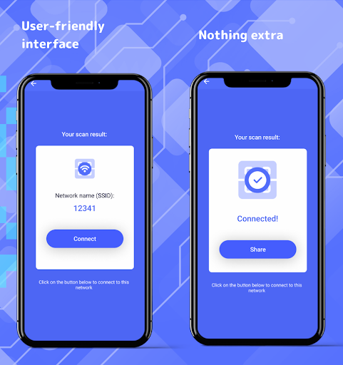 The logic of the Сheck out wifi QR connect is very simple: download, open a scanner, open Wi-Fi on another phone, and generate a code. After that, quickly scan the code with a Wi-Fi scanner program and connect❗