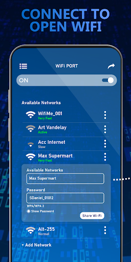 Wi-Fi port is a WiFi helper and super booster that gives you available WiFi near you. Find nearby location WiFi connections and you can see the passwords all of them. Wi-Fi port and Passwords Show is the Best WiFi Map for finding or sharing WiFi network near you. Millions of WiFi hotspots available worldwide so the best way to surf the Internet for using this WiFi networks app.