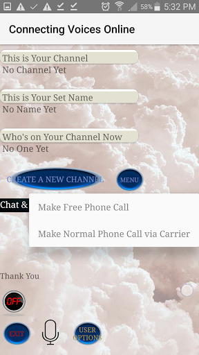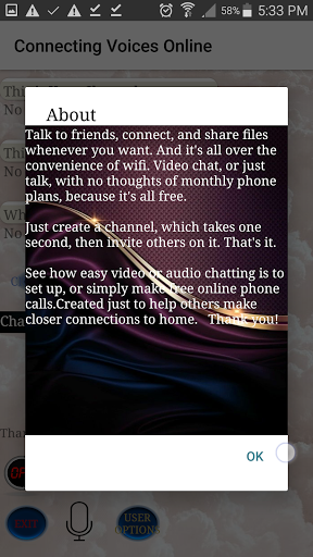Audio chat with friend and family via wifi for free. Make real free phone calls as well. No sign ups or email requests. Just install the app and start talking.