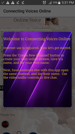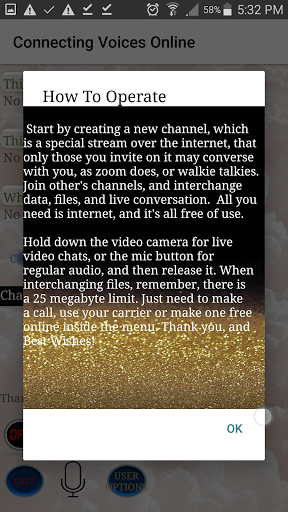 Use is simple. Create a channel as walkie talkies does, then add your name. Invite anyone to join your channel, by having them open the same channel and listing their name.