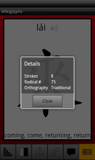 - Selecting characters will display the character with English translation, pinyin representation, pronunciation, how its used, and details such as stroke number, radical number and orthography (i.e. simplified or traditional).
