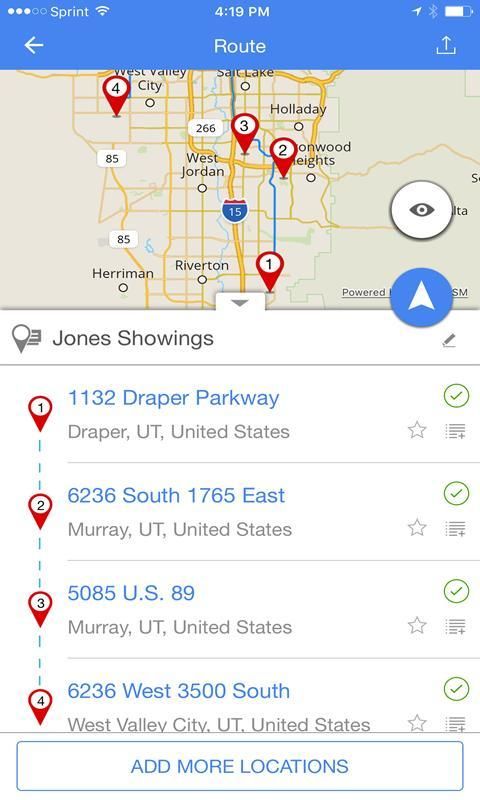 During navigation, addresses will show up as colored pins along the route. We have added in the option of taking pictures and notes associated, and saved with that location. This helps keep things organized when showing homes is over and offers needs to be made.