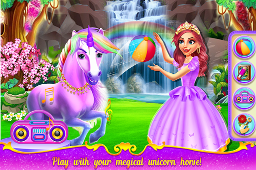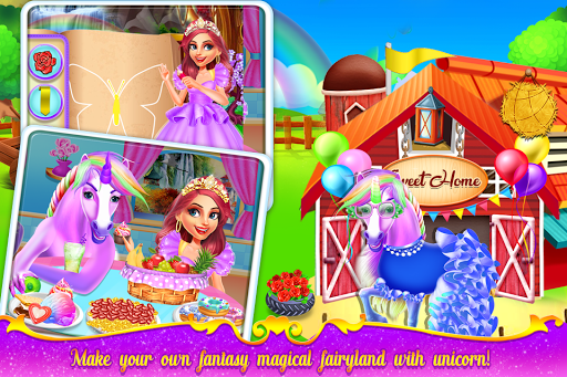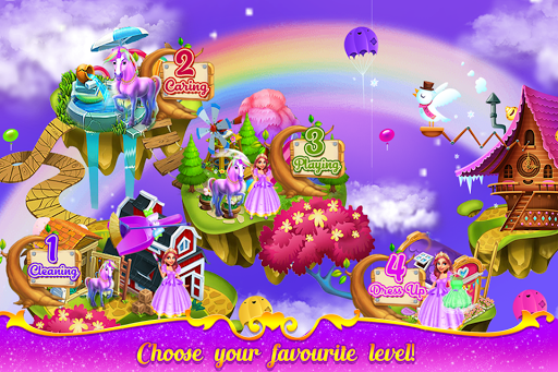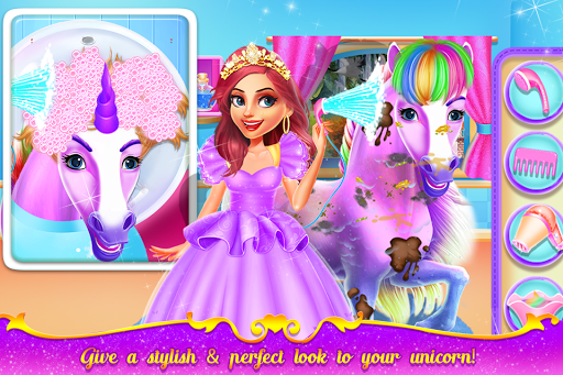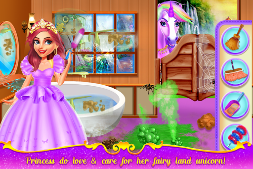 Being a magic unicorn in FairyLand can be hard sometimes. That is why you are going to help this princess to maintain her unicorn and his house clean. This unicorn game has different levels and you got to clean a house, perform nursing activities and also you will play a lot. First of all, you will begin the game with the chores that need to be done around the stable. Wash the floors, remove the stains, get rid of the spiders, clean the windows and make everything looks shiny. Now you will continue with the unicorn cleaning. Give him a bubble bath and make sure you clean his dirty hair. After the washing, you must take care of his hair, apply the treatment and then refresh his main color. You might also want to cut the extra hair and arrange it with a suitable hair device. After the whole pampering, you will make sure that the unicorn is happy and fulfilled. So, use toys and interactive games with the princess to entertain him. Play some music, draw something and throw a ball, maybe you can feed him with some delicious treats. Next, you don't have to be shy when it comes to dressing up. So, add bold colors and make this magic fairy unicorn a fashion item. Combine the wardrobe we have and assemble a lovely outfit that will highlight the cool hairstyle he just got. Use your creativity and add pretty accessories to complete the look of the unicorn.