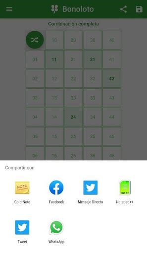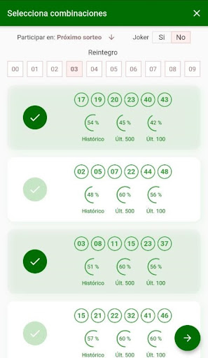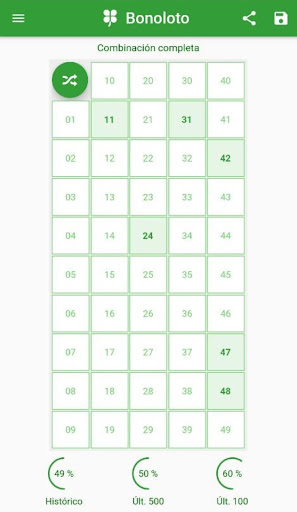 Create your numbers whenever you want and save the best combinations that we calculate based on historical draws, last draws, draws prior to the current one, hot numbers, numbers that appear the least... and many more parameters that make your combination optimal and with a high percentage of success