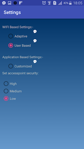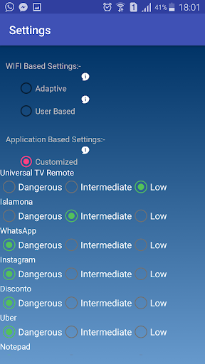 This mode enables the user to select the security level of the network manually such as high, medium or low. Based on that Wi-Secure will block the applications.