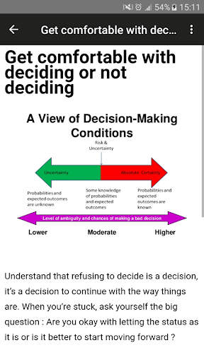 Ever dreamed of being on the road to success after your decision making ? Ever been faced with the a situation where you need to make a decision important for your futur ? This app will guide you to make decision efficiently, it will tell you the ways to guide you in your life choices. Know how to proceed with decision making. Spend a small time with this guide and be ready for the accumulation of wise choices after completing the decision making process.
