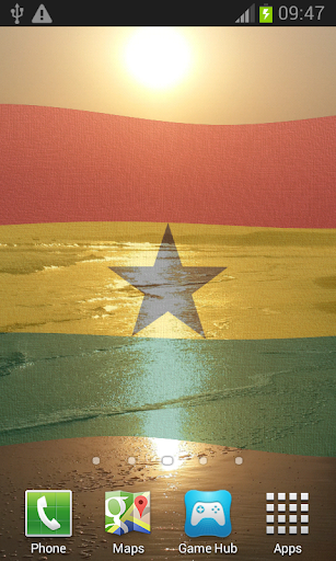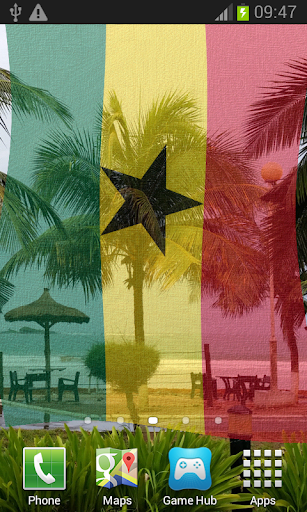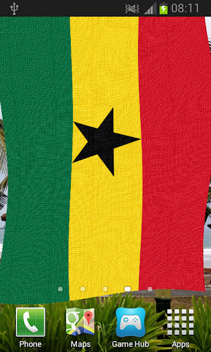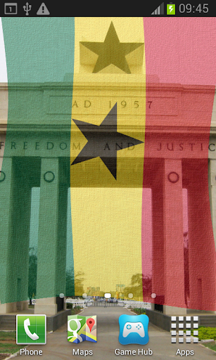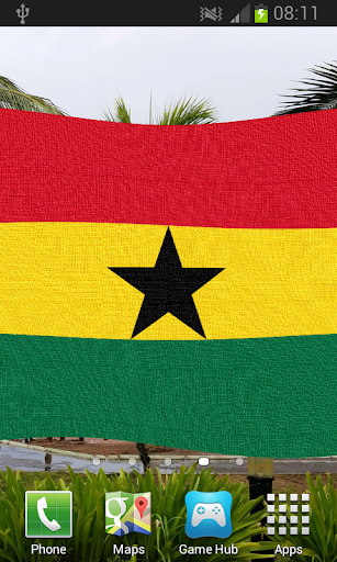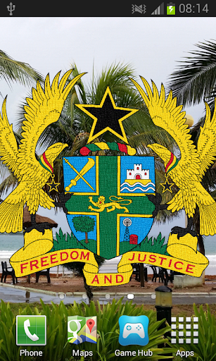 Ghana Flag Live Wallpaper features iconic images of Ghana overlaid with the Coat of Arms or Flag billowing in a soft gentle breeze.
