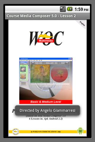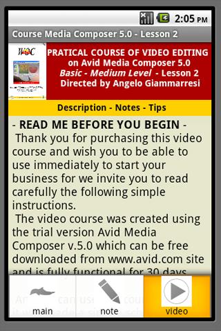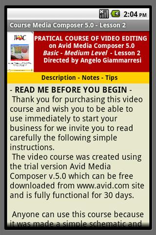 Each application is composed of some screens selectable from the menu, containing general information about the course, any suggestions and notes on the lesson, one or more video clips format 480x320 H.264 MP4 codecs.