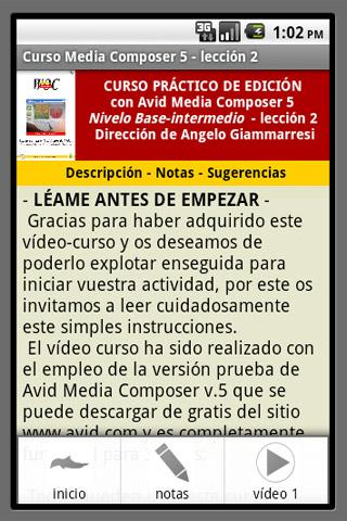 Cada aplicativo consiste em alguns chips, selecionáveis o cardápio, E contém informações gerais sobre o curso, sugestões e notas na lição, um ou mais formato de clipes de vídeo .mp4 Codec H.264 Tamanho 480x360.