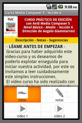 Ang bawat application ay binubuo ng ilang mga chips, piliin mula sa ang menu, E ay naglalaman ng pangkalahatang impormasyon tungkol sa kurso, mga suhestiyon at mga tala sa aralin, isa o higit pang mga format ng video clip .mp4 codec H.264 laki 480x360.
