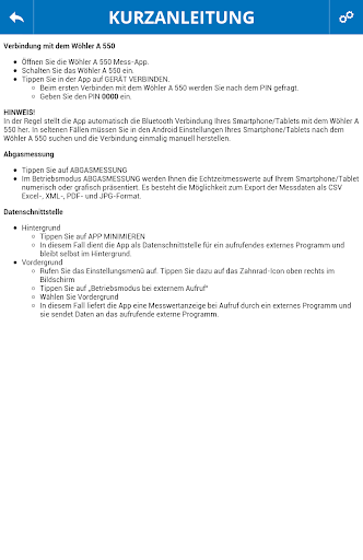 Mit dieser Android App lassen sich die Messwerte von Wöhler A 550 Rauchgasanalysegeräten auf dem Android-Gerät grafisch und numerisch darstellen, exportieren und zu einem mobilen Verwaltungsprogramm übertragen (gemäß der ZIV Spezifikationen).