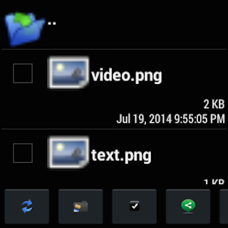 The icon from left to right means: Refresh, Send file, go to SD Card folder, Select All, Share files, Rename file, Delete File, Order by Name, Order by length, New Folder, copy file, cut , paste, cancel.