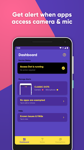 Access Dot enables you to find out if any app is using your phone's camera or microphone without your knowledge just like iOS14 but with several more style options!